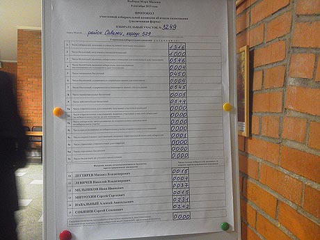 На участке в МЖК, где мы наблюдали подсчёт голосов, как обычно аномальные результаты: Собянин — 44,5% (241 голос), Навальный — 42,5% (231), Мельников — 6,8% (37), Митрохин и Дегтярев — по 2,76% (15), Левичев — 0,74% (4). Явка 41,5%. Предварительные итоги выборов Мосгоризбирком до сих не объявил (по состоянию на 2:00 понедельника, 9 сентября).