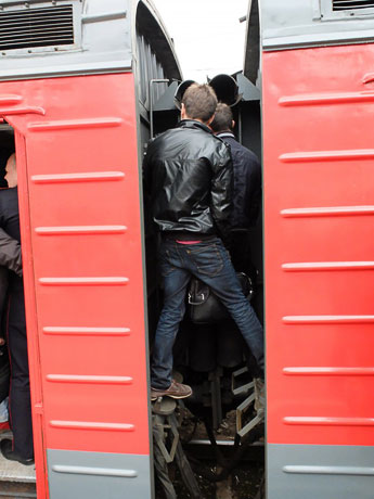 Зайдя в тамбур, многие там и оставались, опасаясь, что не смогут выйти на своей станции. В результате получилось, что середина вагона иногда была полупустой. Говорят, помощник машиниста бегал вдоль состава и заталкивал пассажиров внутрь, чтобы закрыть двери — совсем как в токийском метро. Перенимают наши пассажиры и практики индийских железных дорог, где двери часто вообще не закрывают, а пассажиры ездят на крышах и между вагонами.