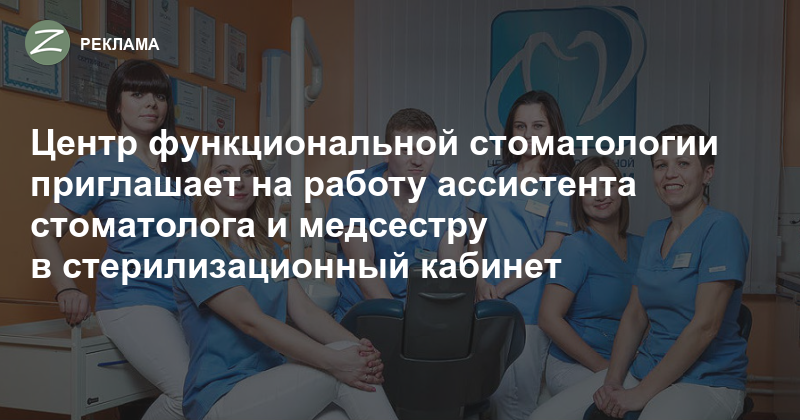 Центр функциональной стоматологии приглашает на работу ассистента стоматолога и медсестру в стерилизационный кабинет