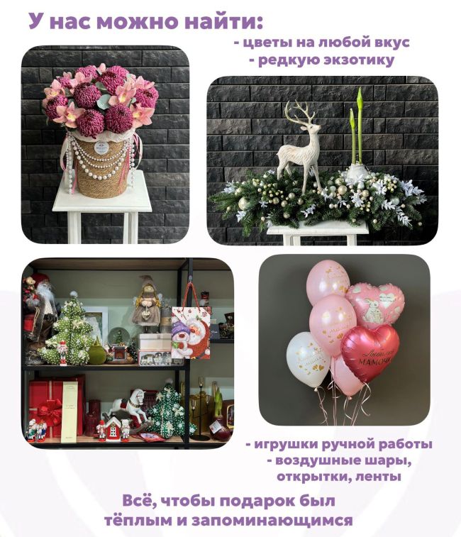 Студия создаёт стильные букеты, композиции и подарочные наборы, которые делают моменты по-настоящему особенными. Работа ведётся ежедневно, принимаются онлайн-заказы, а доставка осуществляется быстро и бережно.