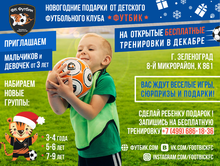 Сделай своего ребенка счастливым прямо сейчаc, запишись на бесплатные тренировки по телефону 8 (499) 686-18-36, на сайте футбик.com или в группах «ВКонтакте» или Instagram.