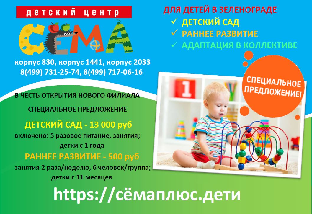 В честь открытия нового филиала ДЦ «СЁМА плюс» в корпусе 1441, предоставляем невероятно выгодное предложение для родителей — скидки на детский сад до 50% во всех филиалах сети*.
