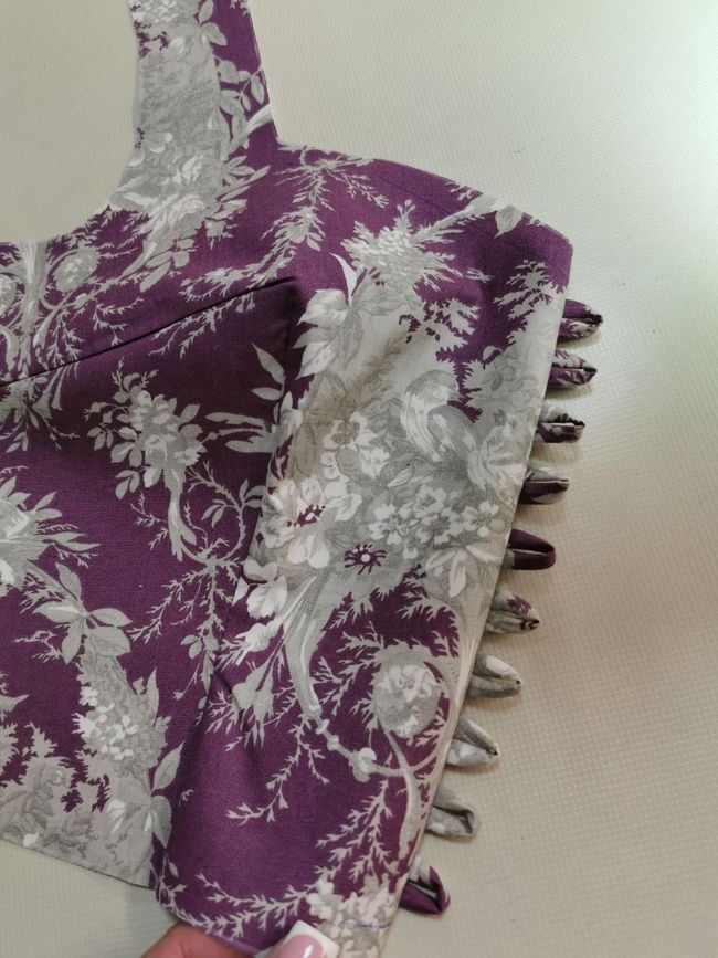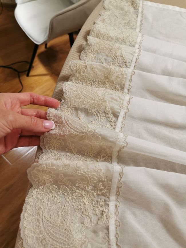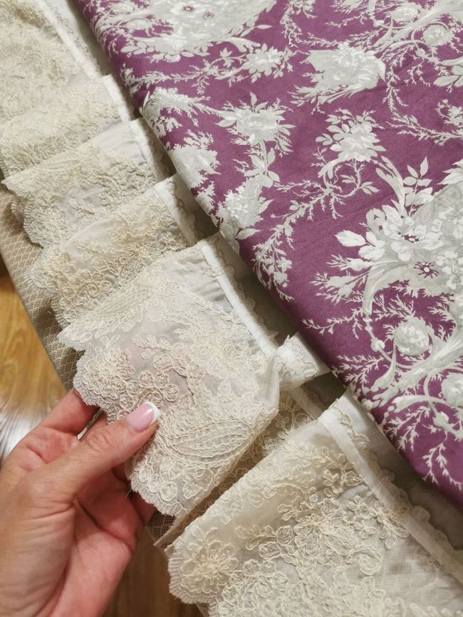 Всё изделие выполнено из натуральных тканей, поэтому и кружево выбрано также натуральное — хлопковая вышивка на шёлковом батисте.