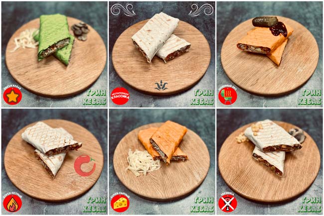Разнообразие. В меню «Грин кебаб» можно найти большой ассортимент кебабов на любой вкус. Помимо нестареющей классики трёх разных размеров (от mini до XXL) имеются кебабы для настоящих гурманов: