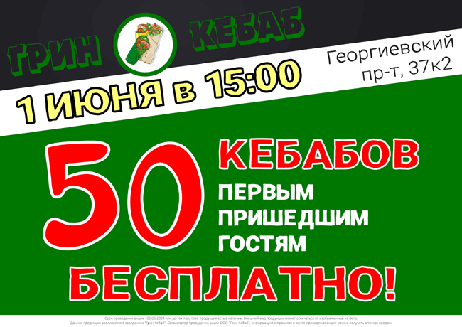 Главное открытие этого лета — в самый первый его день. Первые 50 гостей смогут попробовать стандартные кебабы из меню «Грин Кебаб» совершенно бесплатно!