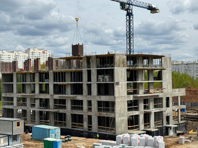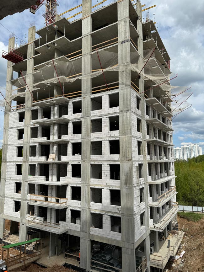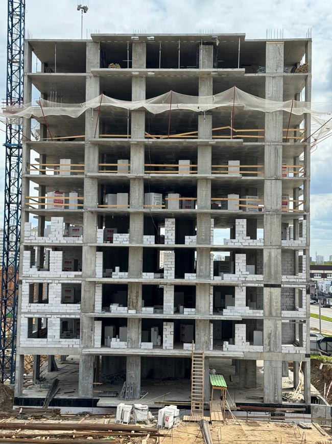 Срок сдачи первой очереди запланирован на второй квартал 2025 года. В данный момент ведутся монолитные работы, кладка блока и возведение межквартирных и межкомнатных перегородок.