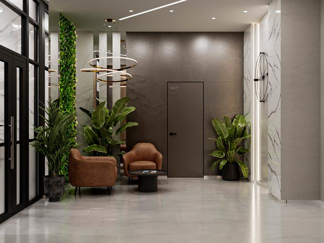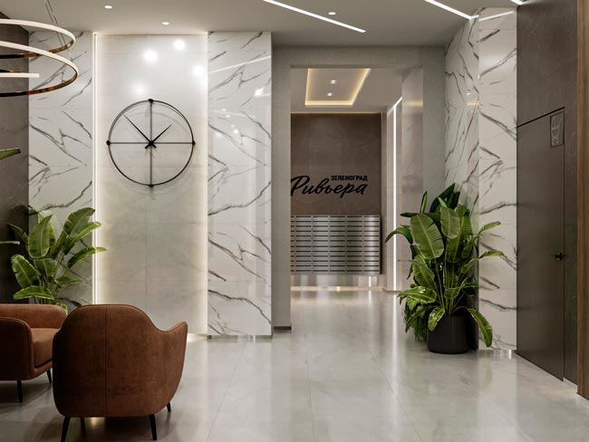 Дизайнерские интерьеры входных групп являются логичным продолжением архитектуры зданий и концепции благоустройства территории. Панорамное остекление, характерное для пространств бизнес-класса, обеспечивает максимум света уже на пороге вашего жилого дома. Природные мотивы, цвета и материалы в отделке подчеркнут уникальность жилого комплекса, созданного для комфортной и активной жизни в окружении первозданной природы.