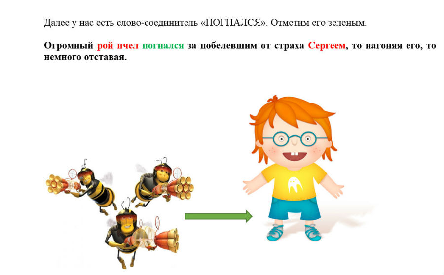 Давайте разберем эту ситуацию на простом примере. Текст из учебника по чтению за 3-й класс, но это не меняет сути дела. Итак, предложение из этого текста: «Огромный рой пчел погнался за побелевшим от страха Сергеем, то нагоняя его, то немного отставая».