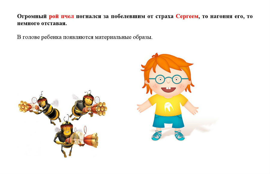 Далее — «РОЙ». Слово «РОЙ» ассоциируется с пчелами, так что здесь все хорошо. Затем — «ЗА ПОБЕЛЕВШИМ», и тут даже сложно представить, какой образ возникает в голове у ребенка. Фраза «ТО НАГОНЯЯ, ТО НЕМНОГО ОТСТАВАЯ» также не несет информативного смысла, но отнимает значительное время на визуализацию и запоминание.