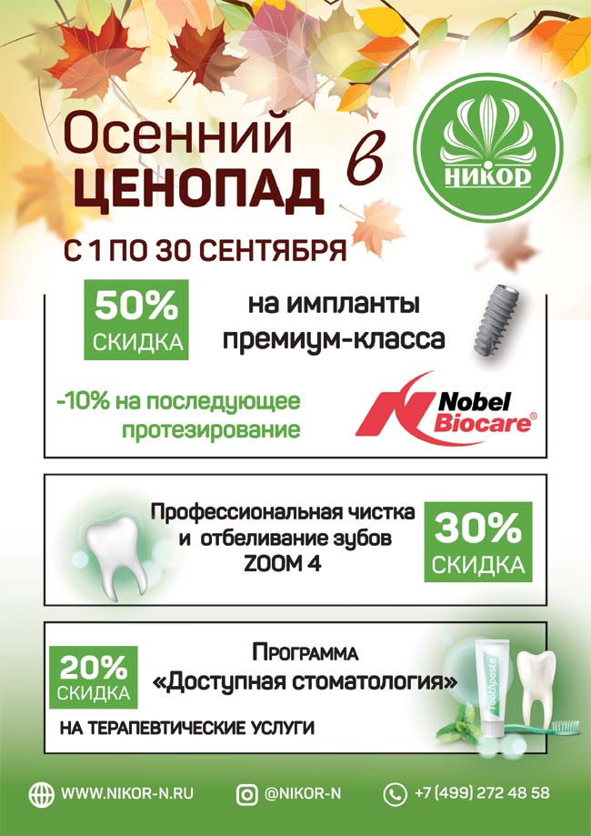 До 30 сентября в сети стоматологических клиник «Никор» — скидки на услуги до 50%: имплантаты Nobel Biocare, профессиональную чистку зубов, терапевтическое лечение.