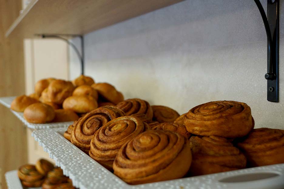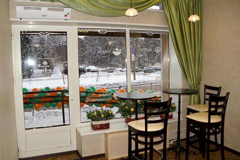 При входе у больших французских окон размещено пару столов, за которыми не спешно можно отведать ароматного кофе с десертами. На витринах продукция исключительно собственного производства. Тут каждое утро пекут чиабатту, багеты, фирменные брецеля и, конечно же, пирожки с ватрушками.