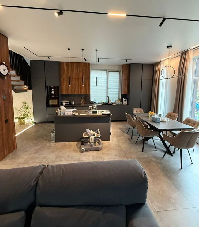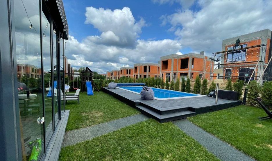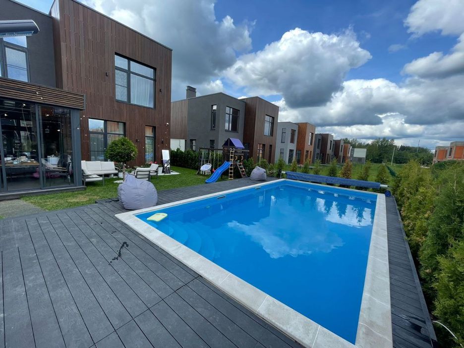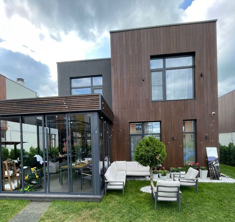 У нас коттедж с четырьмя спальнями. Нам сначала понравилась современная, стильная архитектура, спокойные цвета, ничего лишнего. Потом мы оценили простор и комфорт внутри дома. Здесь комфортно спать, есть, работать, отдыхать, играть с детьми, собираться всей семьёй. У всех есть и свои удобные комнаты, и общее пространство. Дом тёплый, построен добротно, большие окна — много света. Мы сами обставили дом, сделали дизайн-проект, купили мебель. По-моему, получилось хорошо. Здесь вообще хорошо и в жару, и в холод, и летом, и зимой. Из кухни-гостиной есть выход на террасу — там приятно отдыхать, ужинать всей семьёй. Ходим по своему газону. На участке возле дома я устроил бассейн и детскую площадку. Машины у нас стоят тоже около дома, под навесом.