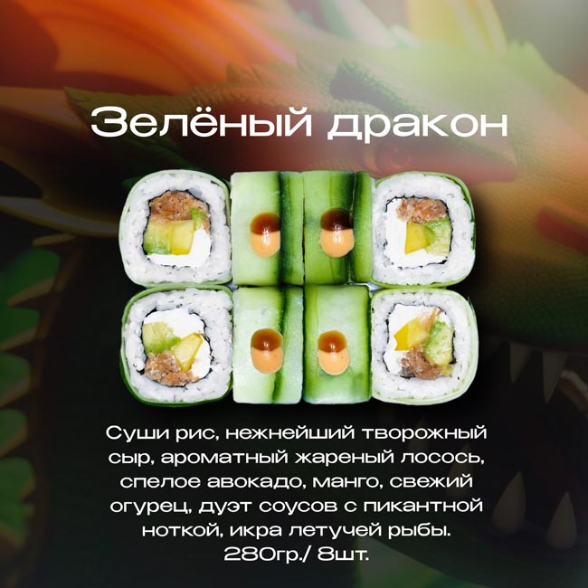Нежнейший творожный сыр, ароматный жареный лосось, спелое авокадо, манго, свежий огурец и все это с дуэтом соусов с пикантной ноткой.
