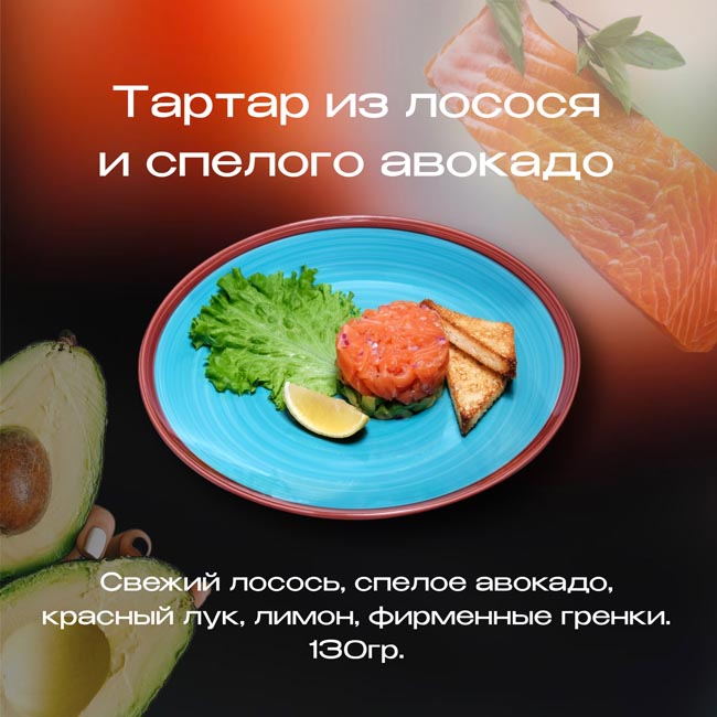 Идеальное сочетание вечной классики в виде свежайшего лосося, красного лучка, спелого авокадо и капельки лимонного сока.