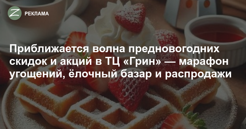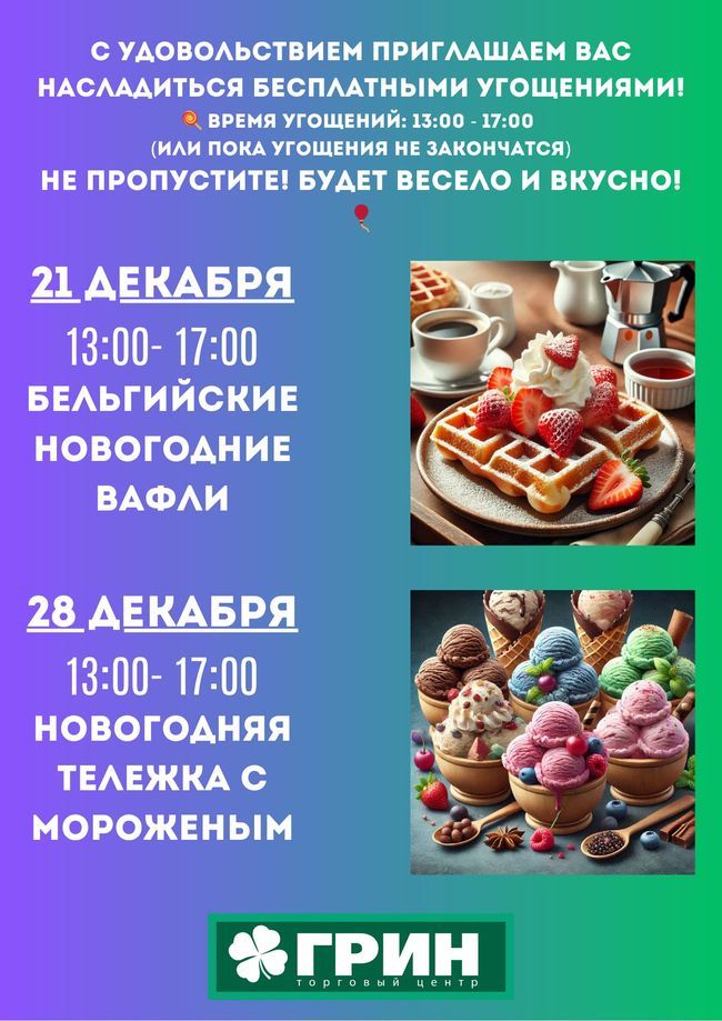Каждое воскресенье, в преддверии самого волшебного праздника — Нового года, ТЦ «Грин» будет рад бесплатно угостить всех посетителей воздушными, ароматными венскими вафлями и мороженым.
