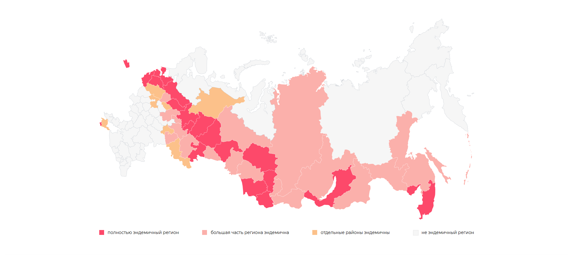 Клещи распространены повсеместно. Но для диагностики инфекции важно, где территориально произошел укус клеща. Так, вероятность заразиться боррелиозом очень высока во всех регионах России. А клещевой энцефалит встречается не везде, в некоторых районах он особенно распространен — такие территории называются эндемичными по клещевому энцефалиту.