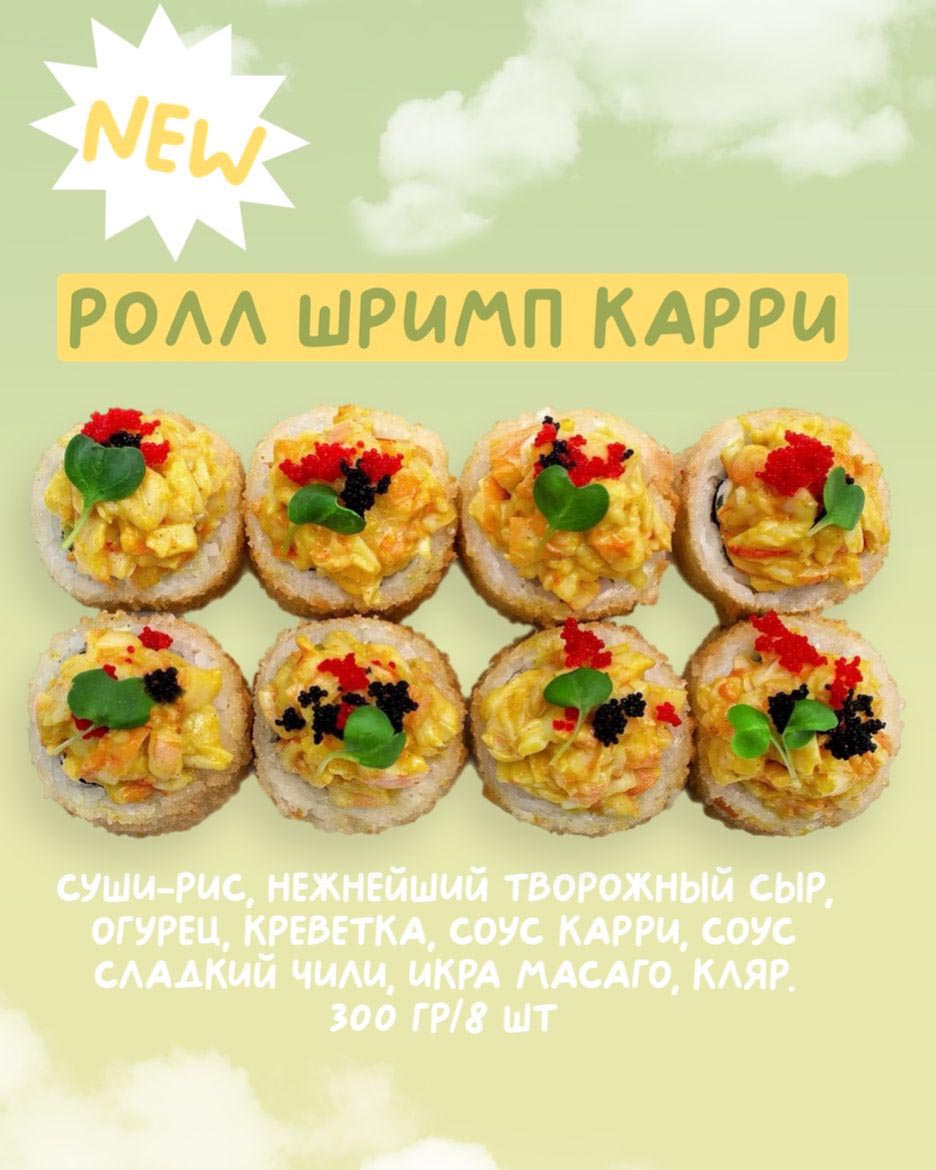 Ролл «Шримп карри» — это пряный соус карри в сочетании с королевской креветкой — такой дуэт заставляет блюдо таять во рту. Просто невозможно пройти мимо!