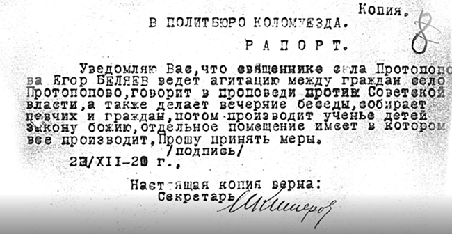 В его приход подсылали осведомителей, один из них, отчитываясь, написал: «Дела, проделываемые попом, делаются так секретно, что пока никак не удается мне проникнуть в его кружок, так как чужих людей они остерегаются, а своих хорошо знают». Не дремал и местный «чекист» — надзиратель за политическими настроениями народа в волости, сигнализируя начальству: «Политическое состояние волости удовлетворительно. Сообщаю третий раз, что священник села Протопопово ведёт агитацию против советской власти, устраивает разные беседы, преподает Закон Божий. Прошу принять меры»
