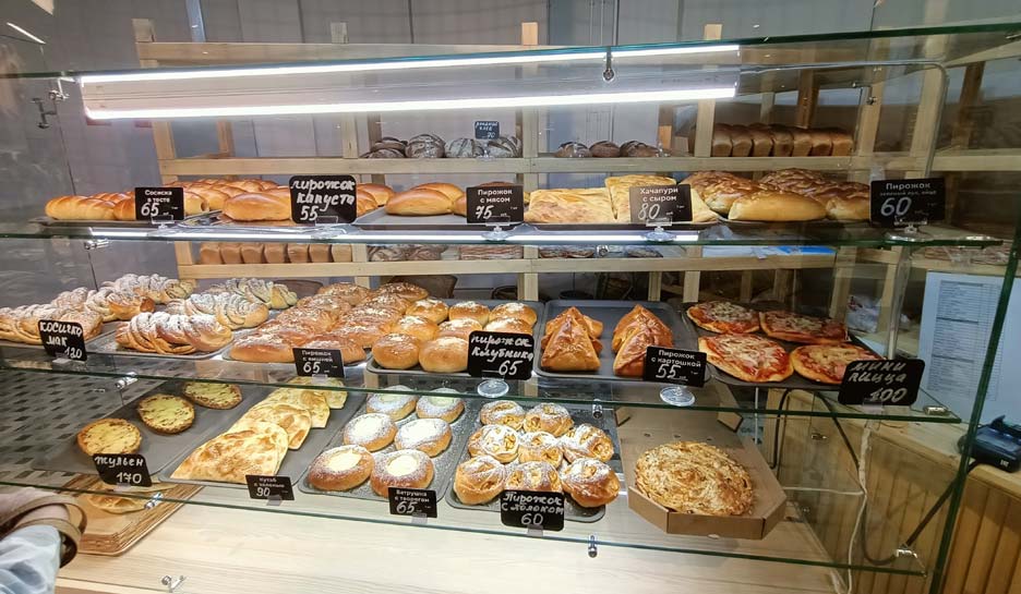 Пирожки: с картошкой или капустой — 55, зеленый лук/яйцо или яблоко — 60, вишней или клубникой — 65, с мясом — 75, сосиска в тесте — 65, ватрушка с творогом — 65, хачапури с сыром — 80, кутаб с зеленью — 90, мини-пицца — 100. Ржаной хлеб — 70.
