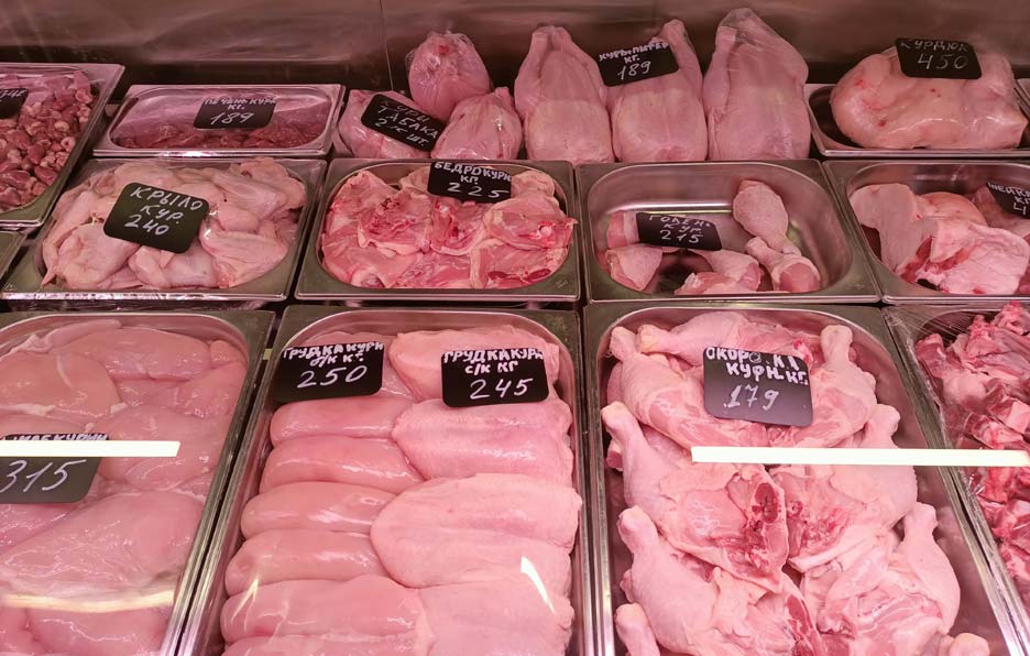Курица: окорочок — 179, голень — 215, бедро -225, тушка — 189, крыло — 240, печень — 189, грудка — 250, филе — 315, сердце — 320, желудок — 169, филе бедра — 325