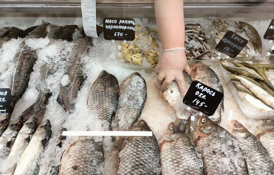 Рыба охлажденная и замороженная: корюшка охл — 645, минтай б/г — 200, нерка охл б/г — 1055, хамса — 170, карась охл — 145, мясо рапана — 670, скумбрия охл — 520, кижуч охл б/г — 865, кета потр б/г — 790, палтус — 885, филе трески — 1080, зубатка — 460, треска б/г — 455,