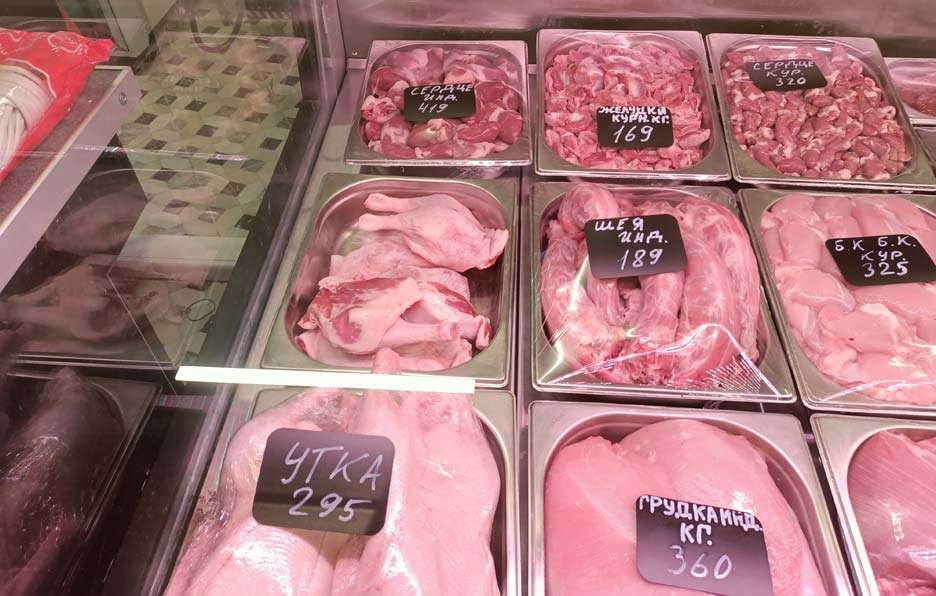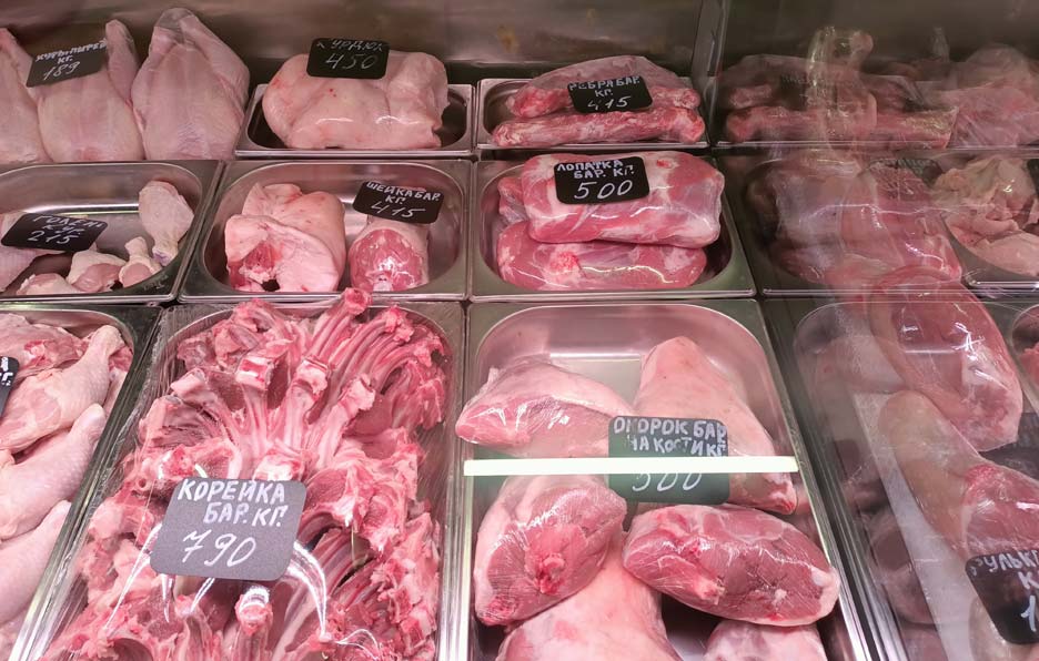 Говядина: шейка — 500, грудинка — 440, лопатка — 600, голяшка б/к — 550, гуляш — 645, ребра — 430, пашина — 199, вырезка — 1300, обрезь — 325, язык — 800, печень — 360, мякоть б/к — 640,