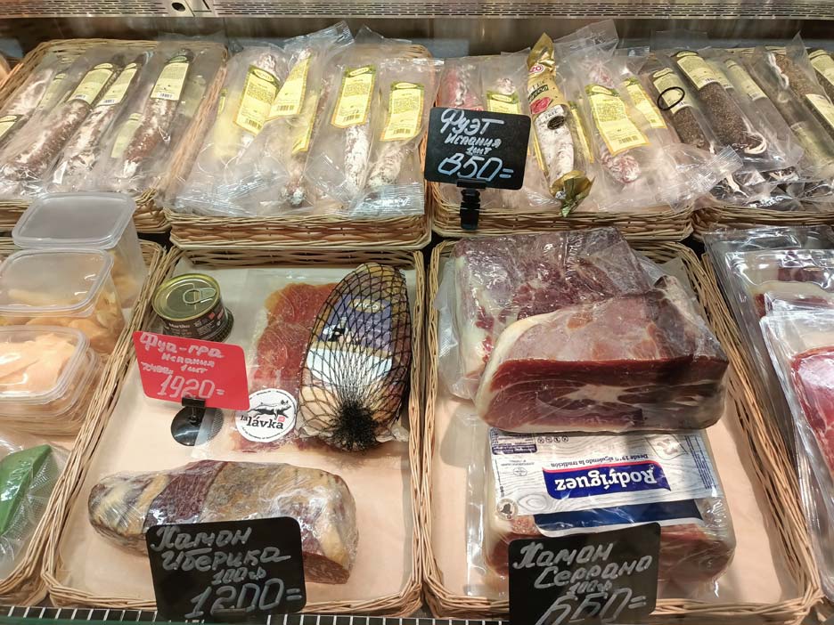 Хамон и прочее: хамон серрано (500 гр) — 3300, хамон серрано (100 гр) — 660, хамон иберика (100 гр) — 1200, хамон иберика нарезка (100 гр) — 1680, фуа-гра (1 шт) — 1920, фуэт (1 шт) — 850.