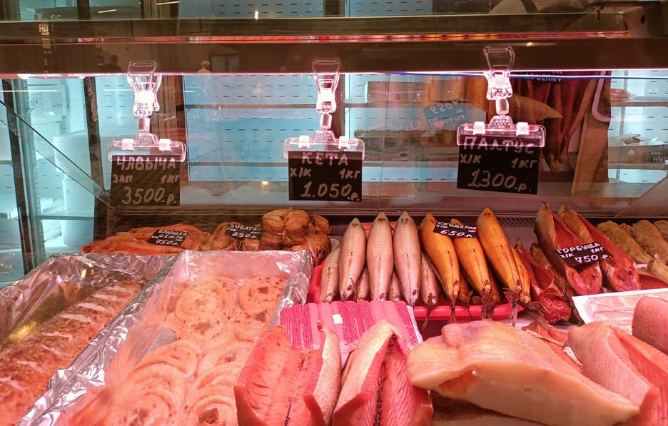 Копченая, соленая, жареная рыба: осетр г/к — 4000-5420, рулет белуга — 2500, сибас х/к — 3300, чавыча х/к — 4200, кижуч и нерка — 4300, масленная х/к — 1350, горбуша х/к — 565-750, скумбрия х/к — 650, палтус х/к — 1300, кета х/к — 980-1050, зубатка г/к — 801-890, семга с/c — 2800, мойва жар — 550, палтус копченый тушка — 1430