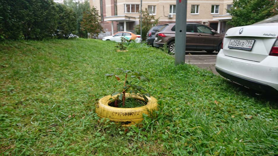 Здесь типовые детские площадки и скамейки — ничего особенного. Некоторые новые элементы уже разваливаются (кажется, сразу после монтажа). Диковато в отремонтированном дворе смотрятся клумбы из старых крашенных покрышек.