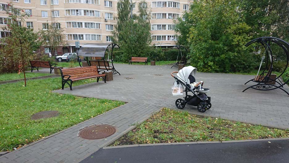 Несколько хаотично расположенных понижений бордюра да пандусы у подъездов — это всё, что здесь есть для удобного передвижения колясок. Детская площадка в центре двора находится на возвышении, входов на неё много, но попасть на неё с коляской можно только в обход.