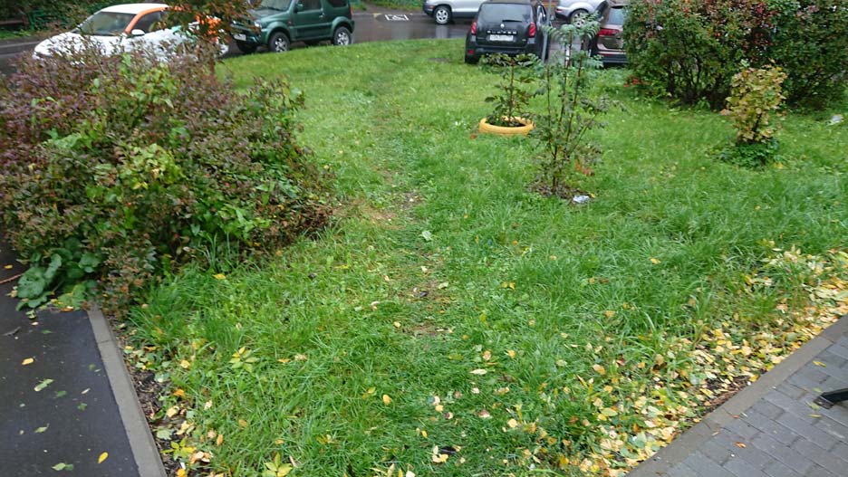 А чуть дальше — от угла корпуса 316 к корпусу 308, пересекая три асфальтированные дорожки, идет широченная тропа. В дождливую погоду грязь с неё разносится по двору.