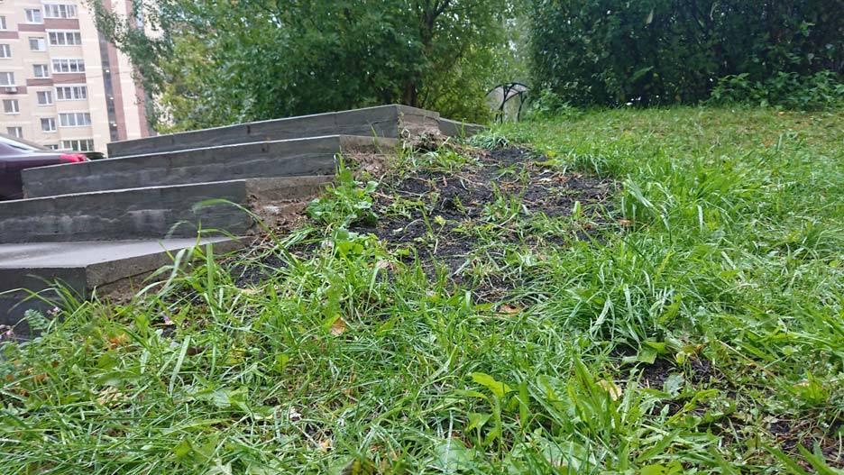На фото — типичный маршрут из подъезда на детскую площадку: после выхода из подъезда очень высокий бордюр без понижения. Затем перейти через дорогу, следующий бордюр с понижением (видимо, остался со времен до реконструкции), а потом крутая лестница без пандуса и перил. Причем, управа сообщила, что лестницы отремонтированы в ходе последнего благоустройства.