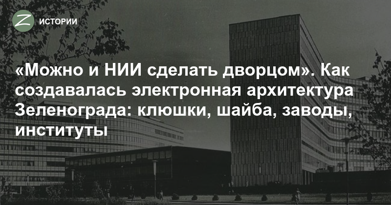 Электронная архитектура — это сверкающие стеклом и пластиком современные корпуса строгих геометрических форм, просторные залитые светом цеха и лаборатории, словом, настоящие «храмы науки и техники». Такие промышленные здания собирались построить в Зеленограде — молодом городе микроэлектроники. Зодчие подумывали об эффектных башнях и дворцах, в которых разместятся НИИ. Рассказываем, почему вместо дворцов построили «клюшки», кому помешали верхние этажи, как работали в лабораториях в валенках и при чем тут инквизиция.
