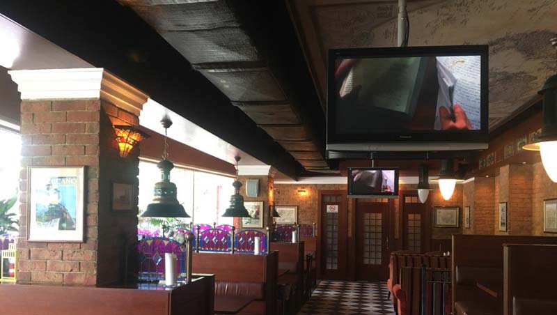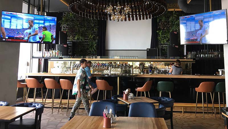 Четыре экрана внутри, два — снаружи, на веранде. Ещё есть раздвижной экран, но его хорошо видно только из центра зала. Есть специальное футбольное меню «доска чемпиона» за 1490 рублей: жареные пельмены, бородинские гренки, сырные палочки, в темной панировке, сырные шарики, креветочные крокеты, варено-копченые колбаски, луковые кольца и картофельные чипсы. Подаются с коктейльным соусом и соусом «Чили».