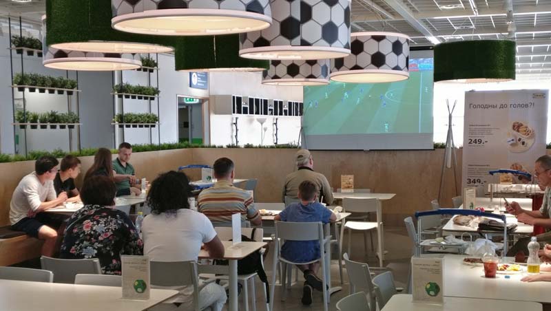 В ресторане выделили зону для просмотра футбола. За полчаса до матча начинают зазывать по громкой связи. Специальные предложения: «Голодны до голов» за 796 рублей (два бургера, два газированных напитка, картошка фри им кружка в подарок) и пивной сет за 349 рублей (пять фрикаделек, два куриных шашлыка, три куриных медальона с картофелем фри и соусами — обычная цена 436 рублей).