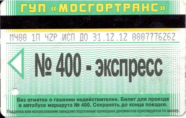 К середине 2002 года турникеты поставили на все внутригородские маршруты Зеленограда. Под этот эксперимент нашей автобазе выделили 90 новых автобусов. И только к 1 мая 2007 года это веяние дошло до 400-х — их тоже оборудовали турникетами. До августа 2013 года для поездки на них требовался особый билет. Вот такой: