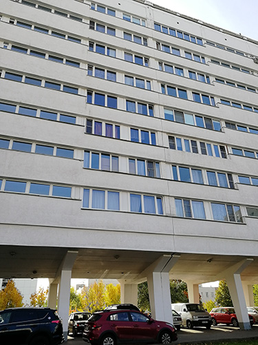 Расположение на главной площади города не сочли достаточно веским аргументом. Убедительным оказался другой довод: в Зеленограде остро не хватало двухкомнатных квартир для молодых семей, и зодчие предложили все квартиры этого дома сделать «двушками». Почти все. И тогда индивидуальное проектирование было разрешено — одно на весь город. Всего в доме длиной в 516 метров сделали 624 двухкомнатные квартиры. И восемь четырёхкомнатных, двухэтажных. Итого — 632.