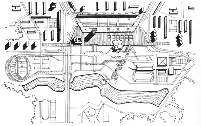 Перед домом-ширмой, будто повернувшимся спиной к городской застройке, задумали длинную зелёную эспланаду, откуда откроется вид на террасный парк с озером. Эспланаду с площадью собирались соединить мостами, под которыми проходила бы транспортная магистраль.
