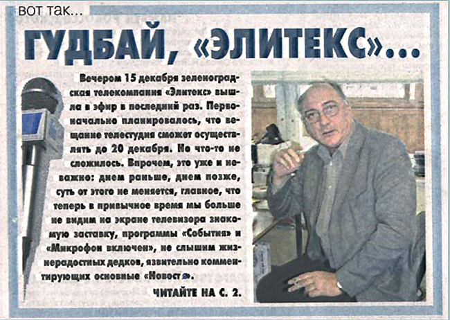 Вечная нехватка средств не позволяла обновить техническое оснащение студии и решить кадровую проблему — зеленоградские телевизионные профи высокого класса предпочитали работать в Москве за весьма приличные деньги, а «Элитекс», увы, не мог предложить им достойный заработок.