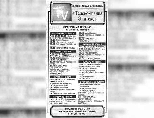 Заметим, что кабельным телевидением в Зеленограде в начале 1990-х занималось несколько фирм. Кроме «Контакта» («Элитекс»), в некоторых районах работал кабельный телеканал «Тевис». Зрители их особо не различали и называли просто кабельным телевидением. Передачи кабельного ТВ начинались вечером в 18:40 и состояли из двух блоков. Первый блок — реклама, мультик, фильм. Второй блок, с 21:40 — реклама, фильм для взрослых.