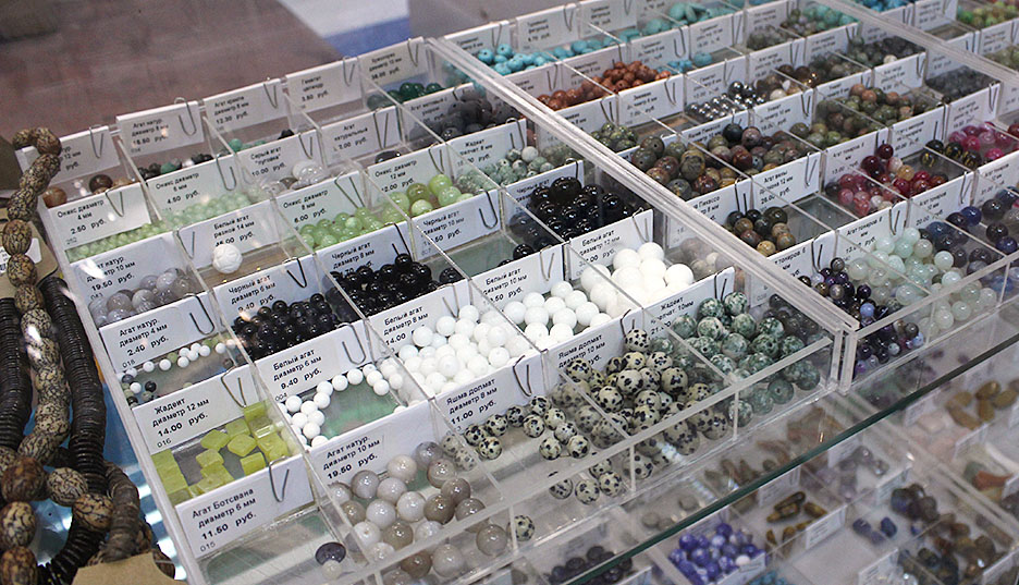 Например, стеклянные бусины. Их можно приобрести по отдельности, большую часть магазина занимает остров с коробочками, полными переливающихся разноцветных бусинок, стеклянных, пластиковых, металлических и деревянных. Но можно покупать и нитками, это значительно выгоднее. Цены на ниточки стеклянных бусин начинаются от 40 рублей. А ещё есть низки натуральных камней, целая сокровищница Али-бабы. Агат, сердолик, яшма, тигровый глаз, лазурит, оникс, аметист… всего не перечислить.