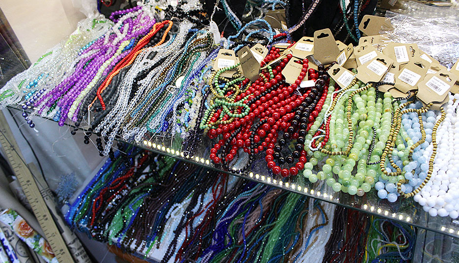 Если вы не умеете создавать бижутерию самостоятельно, то в магазине можно подобрать уникальные авторские украшения. Хозяйка отдела «Бусинка к бусинке» Елена Павленко делает их самостоятельно, используя как натуральные камни, так и бусины из итальянского стекла собственного производства. Такое украшение точно будет неповторимым. А если у вас завалялись любимые бусы, вышедшие из моды, Елена может помочь превратить их в современный яркий шедевр.