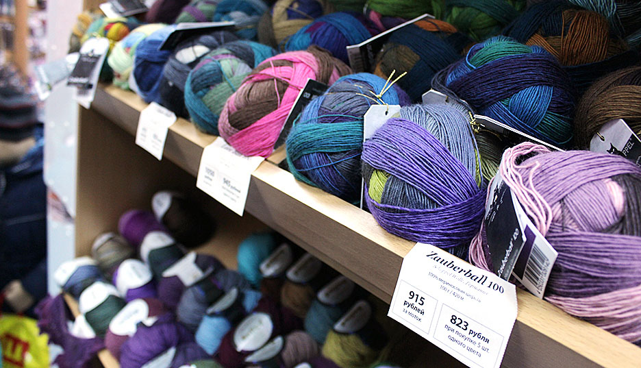 Основное пространство отдела «Рыжая овечка» занимают стеллажи с пряжей. На них можно найти как самые популярные марки с доступными всем и средними ценами (турецкие Alize, NAKO и YarnArt, российские «Пехорка» и «Троицкая» — от 69 рублей за моток), так и более дорогие варианты — немецкая пряжа Schoppel и американская Jojoland Yarns.