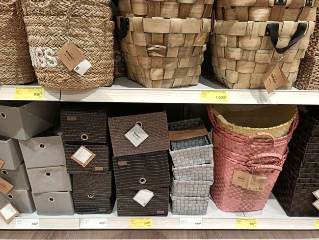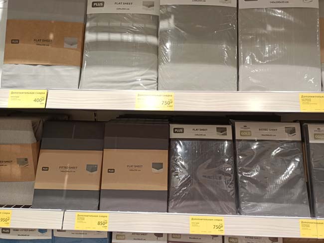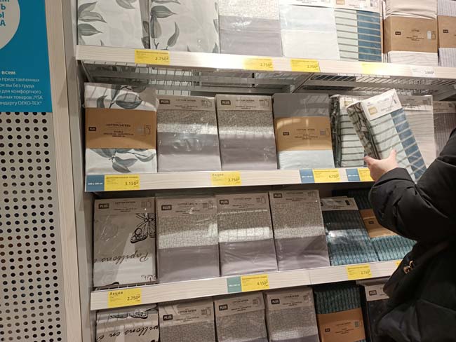 На момент открытия магазин плотно заставлен товарами, покупателей очень много для буднего дня, в кассе очередь. Нам многих товарах специальные желтые ценники «дополнительная скидка». Особенно много их в отделе постельного белья, а также товаров для хранения.