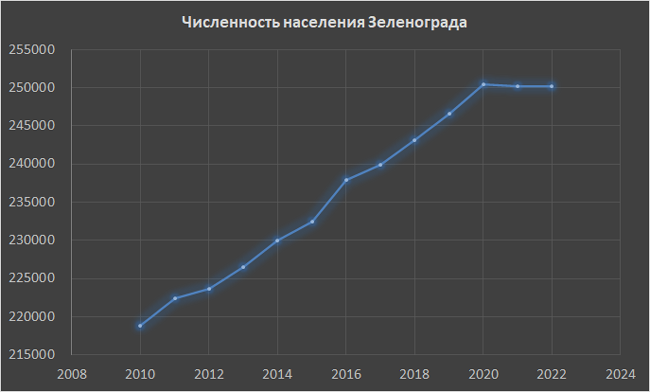 Вот график численности населения Зеленограда по данным Росстата — хорошо видно резкое изменение после 2020 года. Последняя точка (начало 2022 года) — это данные Михальченкова.
