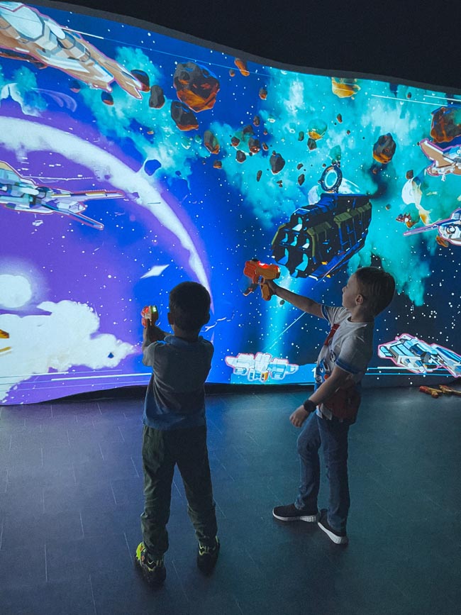 Зона интерактивных игр для детей от 5-7 лет — это пространство с огромными экранами, на которых транслируются различные игровые программы. Можно пострелять в пришельцев, посоревноваться в меткости по метанию подушек, покачаться на качелях «над пропастью», заложить снежный вираж на сноуборде, побыть крутым агентов, идущим к цели через сплетение лазерных лучей. А еще порисовать лазером на стене.
