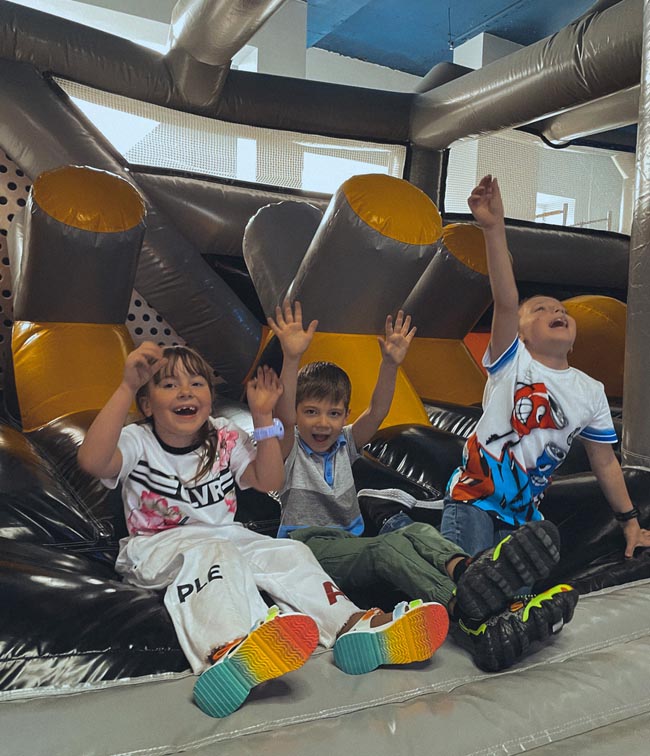 Весь парк разделен на игровые зоны. Есть аттракционы высокой активности с всевозможными горками и лазалками, батутами, зоной препятствий в надувном космическом корабле. Есть огромная песочница с кинетическим песком. Причем интерактивная — на её поверхность проецируется выбранная игра. К примеру, если выбрана Луна, то надо построить из песка каналы для рыб и загоны для кроликов. Это очень увлекательно!
