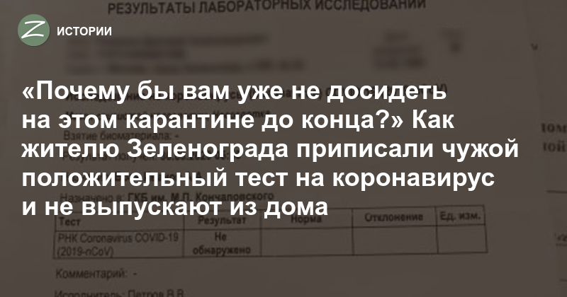 «Почему бы вам уже не досидеть на этом карантине до конца?» Как жителю Зеленограда приписали чужой положительный тест на коронавирус и не выпускают из дома 15.04.2020 ZELENOGRAD.RU