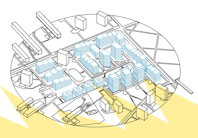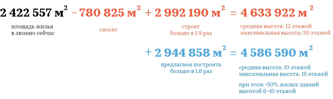 Огромные многоэтажки. Да, в новом районе хотят построить тринадцать(!) 25-этажных домов, два 15-этажных и двенадцать 9-этажных. И это только те, что жилые. Кроме них будут ещё и офисные многоэтажки по 17, 12 и 9 этажей. Вы можете сказать, что с этим ничего не поделаешь, таким должен быть современный город. Но нет. Новый район — это возможность уйти от градостроительных ошибок прошлого и наконец начать строить нормальное жильё. Для этого даже не придётся снижать количество квадратных метров, за которыми так гонятся застройщики. Из-за увеличения плотности домов его реально сохранить. Пример — предложение Городских проектов по реновации в Зюзино.