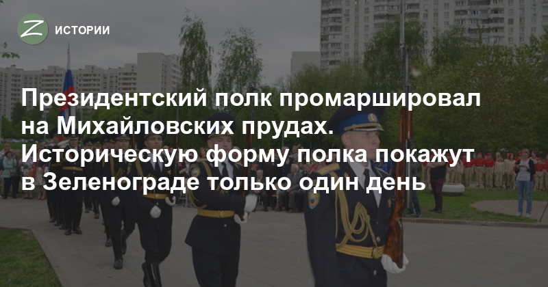 Подразделение Президентского полка прибыло в Зеленоград 14 мая по приглашению школы 1194 — на торжественное открытие в школьном музее (корпус 1555) экспозиции об истории полка и временной выставки «Форма кремлёвцев» образцов формы Президентского полка с 1924 года. Всех зеленоградцев приглашают посмотреть выставку в субботу, 18 мая, с 10:00 до 13:00. А сам Президентский полк уже показал себя горожанам: в честь Дня Победы солдаты прошли строем по бульвару на Михайловских прудах и у мемориала «Штыки» на Ленинградском шоссе, поздравив зеленоградских ветеранов.